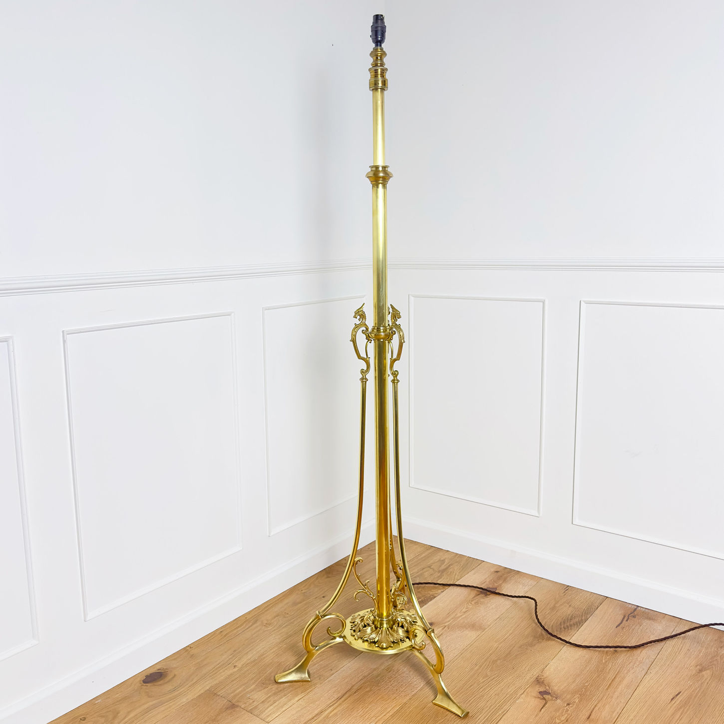 A rare, early 20th century brass floor lamp, the extending column set within supports with dragon head finials, stamped ‘Hinks’; rewired and tested.